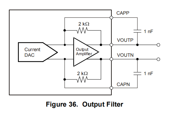 CAPP和CAPN引脚是两个外部电容器的连接,一个电容器连接CAPP和VOUTP,另一个电容器连接CAPN和VOUTN。需要电容器来滤除DAC采样噪声。电容值为1 nF;应使用低电压系数的电容器(C0G陶瓷或薄膜)。