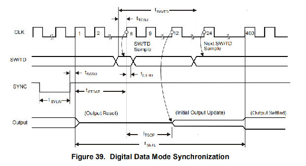 在数字数据模式下,DAC输入是一个1密度的比特流。在此模式下,同步管脚将SW/TD数字数据的采样与所需的主时钟周期(CLK)同步。当SYNC低或高时,DAC正常工作。当同步从低到高时,DAC输出被重置为零,SW/TD的采样瞬间被重置为随后的第八个上升CLK边缘。然后在随后的16个CLK间隔定期对SW/TD进行采样。在同步之后,DAC输出不被设置,并在400个CLK周期之后实现完全的设置,如图39所示。