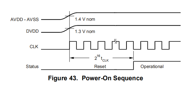 在通电时,当DVDD的后者超过约1.3v,或AVDD–AVSS的差值超过约1.4v时,内部加电复位(POR)发生。在POR期间,如图43所示,设备在216个fCLK周期内保持在复位状态。在此期间,DAC1282输出保持在0 V,差分。在此期间无法进行SPI通信。重置时间过后,默认设置加载:31.25 Hz,28 mVRMS振幅,输出关闭。然后可以启动SPI通信。