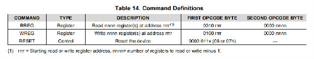 说明:这两个操作码字节读取寄存器数据。寄存器读取操作是两个字节的操作码输入,然后是一个或多个字节的寄存器数据作为输出。命令的第一个字节是操作码和寄存器地址的组合。命令的第二个字节指定块中要读取的寄存器数(减1)。寄存器数据在命令输入后输出。注意,对于多个寄存器读取操作,当超过最后一个寄存器时,寄存器地址指针不会换行。
