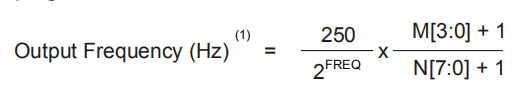 在正弦模式下,DAC1282提供正弦波输出。内部信号发生器产生正弦波信号。M[3:0]、N[7:0]和FREQ寄存器位对输出频率进行编程。频率范围可编程为0.4883 Hz至250 Hz,如等式1所示。