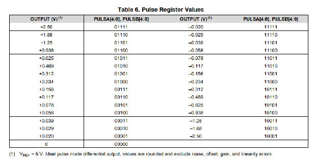 在脉冲模式下,使用快速响应的5位脉冲DAC来产生输出。脉冲数模转换器被设计成近似于线性单位dB的输出函数,允许在所有范围内产生脉冲测试信号。两个寄存器用于预置DAC输出。同步引脚用于选择两个寄存器中的一个。当SYNC低时,PULSA寄存器值驱动DAC;当SYNC高时,PULSB寄存器值驱动DAC。脉冲寄存器可编程为产生-2.5 V至+2.5 V的差分输出。请注意,脉冲电平与VREF成比例,且与模拟增益设置无关。表6列出了脉冲A和脉冲B寄存器的可编程范围。