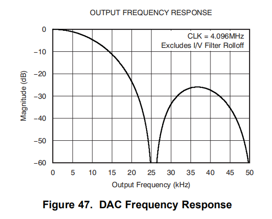 DAC内部信号发生器能够输出0.489 Hz到250 Hz的信号频率。通过使用外部数字输入(比特流)直接驱动DAC,也可以获得超出此范围的频率。然而,DAC低通滤波数字输入并产生sinx/x频率响应。DAC滤波器的–3 dB信号带宽为8.2 kHz。图47显示了DAC1282的频率响应。请注意,高阶噪声形状的数字输入可能会由于噪声增加而限制可用频率范围。