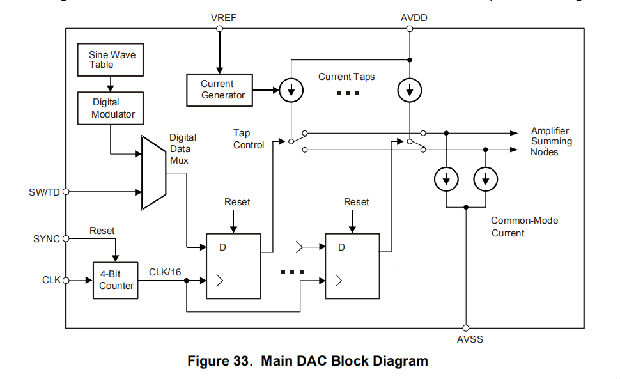 当数字输入被采样时,电流控制级将抽头电流切换到正或负电流求和节点。一个更高的密度引导一个节点比另一个节点增加平均电流,从而增加差动电流。差动电流通过内部I/V转换器级转换为差分电压。共模电流源在放大器求和节点处平衡电流。