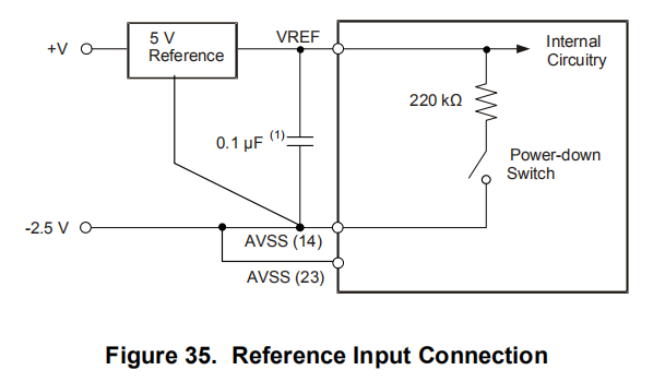 使用星形接头将外部参考接地引脚直接连接至AVSS引脚14。星形连接将电源串扰的可能性降至最低。此外,在VREF和AVSS端子附近连接一个0.1-μF电容器,以降低噪声敏感性。图35显示了引用连接。参考输入阻抗为220kΩ。断电时开关关闭,导致输入阻抗非常高。对于单电源应用,将AVSS连接到干净的模拟接地点。
