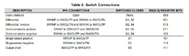 开关由三个寄存器位SW[2:0]控制,也由SW/TD输入引脚控制。当寄存器或SW/TD输入控制改变时,开关集成先断后合操作。SW/TD输入可用于强制开关打开,以精确控制传感器脉冲测试;参见开关控制/DAC数据输入(SW/TD)部分。图37和表8描述了开关操作。