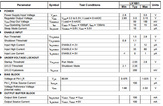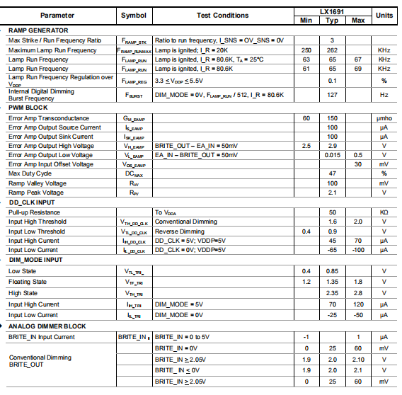 除非另有规定,以下规范适用于工作环境温度-40°C≤TA≤85°C,除非另有说明。测试条件:VDDP=3.3至5.5 V,I_R=80.6KΩ,BRITE_R=BRITE_OUT=20KΩ,OVSNS=OCSNS=0V,DD_CLK=DIM_MODE=浮动