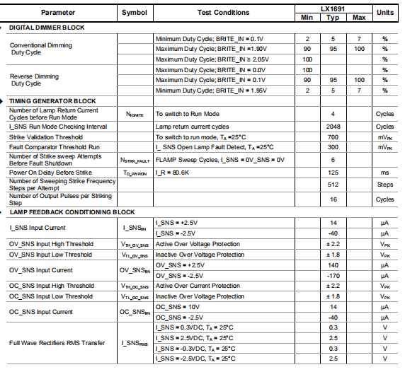 为三个灯输入集成全波整流器显著减少灯反馈部件数量。当前感测(I_-SNS)、过电流感测(OC-SNS)和过电压仅使用一个外部检测(OV_SNS)信号每个都有定标电阻或电容器。校正精度为改进的高性能片上整流器提供更好的灯电流和电压调节。完全故障保护除灯故障超时外,最大输出电压所有故障条件下的电流都是可调节的。开路电压永远不能超过预设的最大冲击电压电路中的电位和总电流用定标电阻。UL安全规范现在可以轻松满足任何应用程序。熟悉的磁学LX1691可以使用与所有其他直接驱动相同的磁力控制器。变压器设计参考应用注释13以及功率场效应晶体管的选择标准。