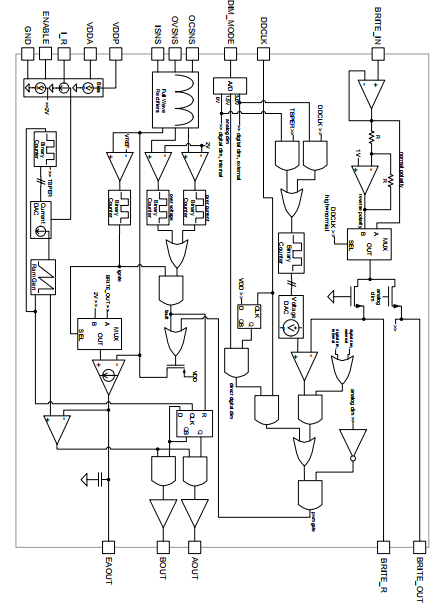 数字调光时钟/调光极性。一种输入引脚,可以选择它来控制数字信号的突发频率调暗。此输入可强制至VDDA或VSS或任何高达1MHz的时钟信号。这个别针也用来在内部时钟数字调光模式下工作时,控制调光极性*。如果DIM_模式处于打开条件(模拟调光模式)DD_CLK输入连接到VDDA或打开(内部上拉)进行选择传统调光极性。接地极性相反。传统的极性意味着灯亮度随着BRITE_IN引脚上电压的增加而增加。相反的极性意味着亮度随电压升高而降低。如果调光模式打开,并且低频脉冲被应用到DD_CLK,灯电流幅值与BRITE_IN处的电压成正比,其占空比遵循DD_CLK波形,例如当DD_CLK较高时电流流动。在此模式下,脉冲计数应大于故障