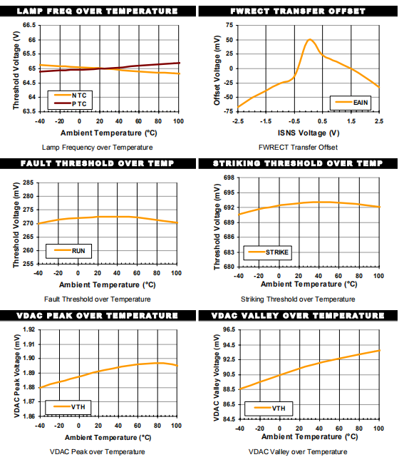 过电压检测输入。以地面为中心的全波交流电压输入,与灯成比例电压。OV_SNS输入将进行全波整流,然后应用到一个数字比较器,参考电压为2V使峰值电压大于2V,以逐个脉冲数字重置PWM逻辑。输入信号的频率范围为10Khz至500KHz。正常工作电压小于±2V,且在负载故障情况下,异常电压可以持续高达±7V峰值。瞬变故障条件可达到±10VPK。输入电压大于±3V峰值但小于±10V峰值可能导致饱和,但不会引起故障、相位反转或IC的可靠性问题。输入有20K±12K(最高超温)下拉电阻器,用作外部电容器的直流恢复器分配筒灯电压。