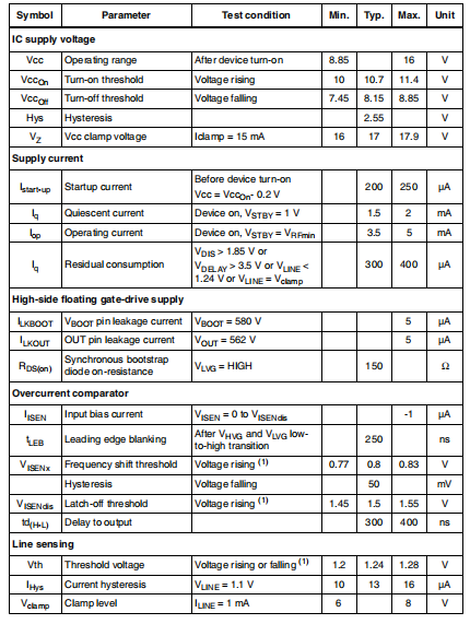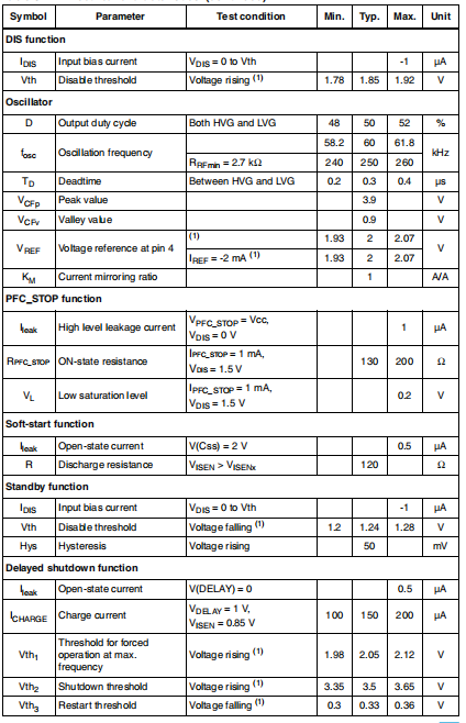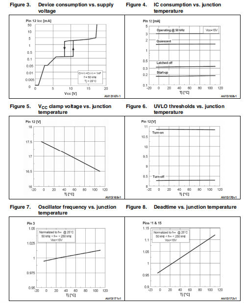 TJ=0至105°C,Vcc=15 V,VBOOT=15 V,CHVG=CLVG=1 nF;CF=470 pF;RRFmin=12 kΩ;除非另有规定。表5。电气特性
