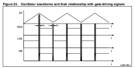 在图23中,振荡器波形和栅极驱动之间的时序关系信号,以及半桥腿(HB)的摆动节点显示。注意,当振荡器三角形上升时,低侧栅极驱动打开,而高侧栅极驱动当三角形向下倾斜时,驱动器打开。这样,在启动时,或者作为集成电路在突发模式操作期间恢复开关,低压侧MOSFET首先接通给自举电容器充电。因此,引导带总是带电的准备好提供高压侧浮动驱动器。
