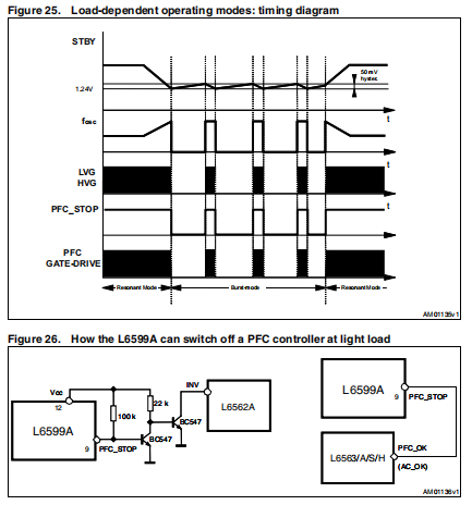 注意,与上一节(“第7.1节:振荡器”)中考虑的fmax不同,这里fmax与大于最小值的某个载荷PoutB相关。PoutB是这样的变压器峰值电流足够低,不会产生可听噪声。然而,谐振变换器的开关频率也取决于输入电压;因此,在图24a所示电路的输入电压范围相当大的情况下PoutB的价值会有很大的变化。在这种情况下,建议使用布置如图24b所示,其中关于转换器输入电压的信息加上施加在备用引脚上的电压。由于强烈的非线性关系在开关频率和输入电压之间,用经验方法求出开关频率与输入电压之间的关系更为实际需要适当的校正量RA/(RA+RB),以尽量减少PoutB的变化。制造一定要选择总值RA+RB远大于RC,以尽量减少对线路引脚电压(见第7.6节:线路感应功能)。无论使用哪种电路,其操作可以描述如下。当负载下降到值PoutB频率试图超过最大编程值fmax和备用引脚(VSTBY)上的电压低于1.24 V。然后,IC停止,两个栅极驱动输出都很低,因此半桥腿的两个MOSFET都处于断开状态。电压由于对能量传递停止的反馈反应,VSTBY现在增加,并且超过1.29 V,IC重新启动开关。过了一会儿,VSTBY又在对能量爆发作出反应并停止IC。这样,转换器以突发方式工作开关频率几乎恒定的模式。然后进一步降低负荷导致频率降低,甚至可以降到几百赫兹。时机图25的图表说明了这种操作,显示了最重要的信号。从备用引脚到地的小电容器(通常为100 pF),放置得尽可能近给IC尽可能减少开关噪声的拾取,有助于获得清洁的操作。即使在功率因数校正的情况下也能帮助设计者达到节能要求在系统中,PFC预调节器先于DC-DC转换器,L6599A允许这样做PFC预调节器可在突发模式操作期间关闭,因此消除了