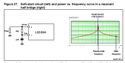 一般来说,软起动的目的是逐步增加变流器功率启动时的能力,以避免过大的涌流。共振变频器输出功率与频率成反比,软启动由从初始高值扫频,直到控制回路接管为止。利用L6599A变频器,只需增加一个R-C系列即可实现软启动从针脚4(RFmin)到接地的电路(见图27,左侧)。最初,电容器CSS完全放电,因此串联电阻器RSS有效与RFmin并行,由此产生的初始频率由RSS和RFmin确定只不过,由于光耦光电晶体管被切断(只要输出电压不是太大远离规定值):