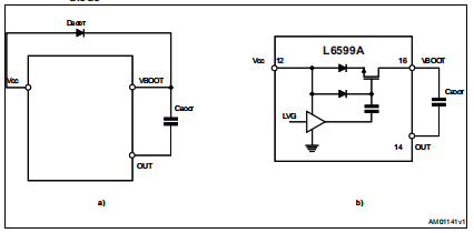 浮动高压侧部分的电源通过自举电路获得。这种解决方案通常需要一个高压快速恢复二极管(DBOOT,图31a)来给自举电容器CBOOT充电。在L6599A专利集成结构中,替换这个外部二极管。它是通过一个工作在第三象限,与低压侧驱动器(LVG)同步驱动,二极管插入如图31b所示。