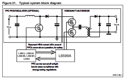 该阶段的空载消耗(0.5 1W)。这不存在合规性问题,因为有关低频谐波发射的EMC法规是指额定负载,因此当转换器在轻载或空载下运行时,应考虑限制。为此,L6599A提供引脚9(PFC U STOP):通常是开路集电极输出开路,当IC在突发模式操作期间空闲时,即被断言为低电平。这个信号是外部用于关闭PFC控制器和预调节器,如中所示图26。当L6599A处于UVLO时,引脚保持打开状态,以便PFC控制器启动