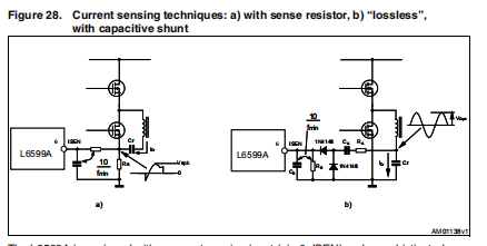 谐振半桥本质上是电压模式控制;因此是电流感测输入仅用作过电流保护(OCP)。与PWM控制的转换器不同,后者的能量流由主开关(或开关),在谐振半桥中,占空比固定,能量流动由开关频率控制。这会影响电流限制的方式实现。而在PWM控制的转换器中,能量流可以简单地通过当感应到的电流超过预设值时,提前终止开关导通阈值(这通常被称为循环限制),在共振半桥开关频率,也就是说,它的振荡器频率必须增加,而这不能与关闭开关一样快:至少需要下一个振荡器周期才能看到频率变化。这意味着,要有一个有效的增加能改变能量流量显著时,频率的变化率必须比频率慢本身。这又意味着逐周期限制是不可行的,因此,输入到电流感应输入端的一次电流信息必须以某种方式平均值。当然,平均时间不能太长,以防止一次电流避免达到过高的数值。在图28中,对几种电流传感方法进行了说明跟随。图28a中的电路比较简单,但是感测电阻Rs上的损耗可能不可忽略,损害效率;图28b的电路更复杂,但是几乎无损,当效率目标非常高时推荐使用。