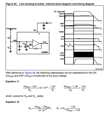 L65A通过内部欠压关闭比较器,如图30方框图所示,其非反相输入为可在针脚7(线路)处获得。比较器内部参考1.24 V,并禁用如果施加在线路引脚上的电压低于内部参考电压。在这些下面条件:软启动放电,PFC U停止引脚打开,消耗IC减小。当针脚上的电压高于参考。比较器提供了电流滞后,而不是更常见的电压滞后:只要在线路引脚低于参考值,如果电压高于参考值,则断开。这种方法提供了额外的自由度:可以将通过适当选择外部分隔器(见下文)。与电压滞后,相反,固定一个阈值自动修复另一个,取决于比较器的内置迟滞。
