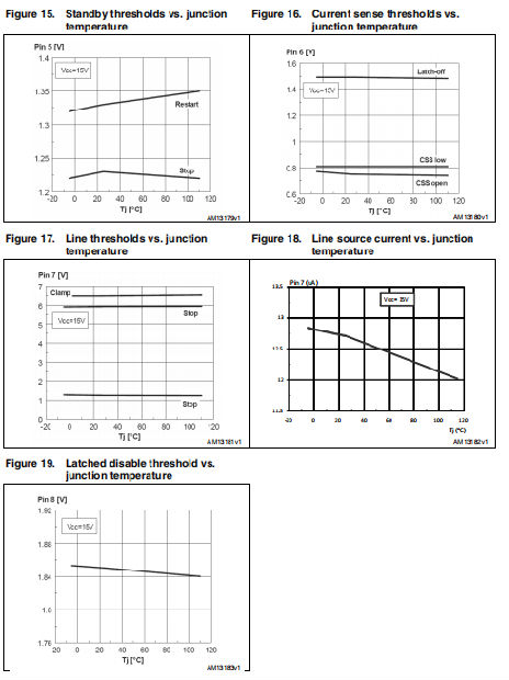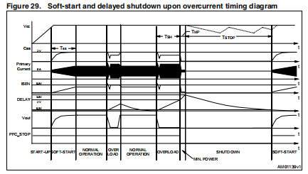 图29的时序图显示了这个操作。注意,如果在TSTOP期间L6599A(Vcc)的电压低于UVLO阈值,IC记录事件并如果V(延迟)仍然存在,则Vcc超过启动阈值后不会立即重新启动高于0.3 V。只要V(延迟)大于0.3 V,PFC U停止引脚也会保持在低水平0.3 V。还应注意,如果过载持续时间小于TSH,则TSH的值如果它们彼此靠近,则下一个过载较低。