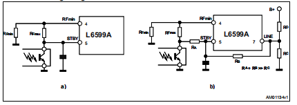 当谐振半桥轻载或空载时,其开关频率为达到最大值。在这些条件下保持输出电压的控制为了避免失去软开关,必须有一些重要的剩余电流流过变压器的磁化电感。然而,这种电流产生了一些防止变频器空载消耗达到非常低的相关损耗价值观。为了克服这个问题,L6599A使设计者能够使转换器工作间歇式(突发模式操作),一系列开关周期间隔两个MOSFET都处于关闭状态的长空闲期,因此平均开关频率可以大大降低。因此,残差的平均值因此,磁化电流和相关损耗大大降低使转换器符合节能建议。L6599A可通过使用引脚5(STBY)在突发模式下运行:如果该引脚下降到1.24伏以下,集成电路进入空闲状态,其中两个栅极驱动输出都很低,振荡器停止,软启动电容器CSS保持其电荷,并且只有2vRFmin引脚的基准保持活动状态,以最小化IC消耗和Vcc电容出院。当引脚上的电压超过1.24 V乘以50时,IC恢复正常工作毫伏。要实现突发模式操作,需要将施加到备用引脚上的电压关联起来反馈回路。图24(a)显示了最简单的实现,适用于窄输入电压范围(例如,当有PFC前端时)。