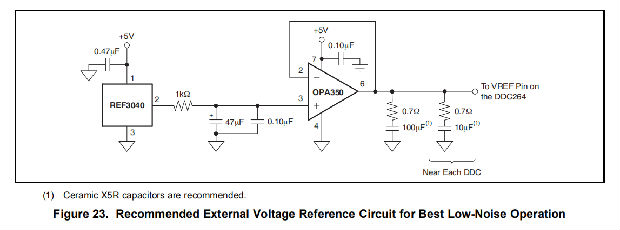 出于这些原因,强烈建议使用运算放大器缓冲外部参考源,如图23所示。在该电路中,参考电压由+4.096V参考电压产生。低通滤波器用于降低噪声,将基准连接到配置为缓冲器的运算放大器。该放大器应具有低噪声和支持VREF的输入/输出共模范围。尽管图23中的电路可能因为输出电容量大而显得不稳定,但它对于OPA350来说工作得很好。不建议在输出引线中放置串联电阻以提高稳定性,因为这会导致VREF下降,从而产生较大的偏移。