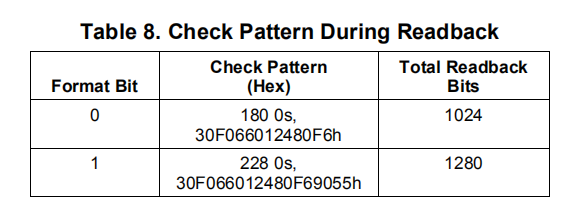 注:Format=1时,校验模式为300位,只有最后72位非零。对于每个DDC264,此输出序列重复两次,配置回读支持菊花链。表8显示了读回期间的检查模式配置。表9显示了配置寄存器读写操作的计时。选通变压器开始正常运行。
