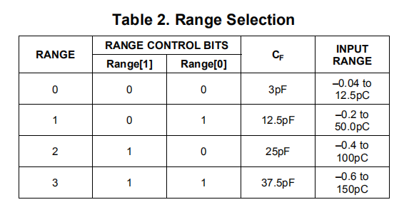 在DDC264中,每个通道的两侧都有四种不同的电容器配置。这些内部电容器在生产中进行了微调,以达到DDC264的量程误差规定性能。量程控制位(量程[1:0])设置所有电容器的值积分器。因此,所有输入和每个输入的两侧始终具有相同的满标度范围。表2显示了为每个量程选择选择的电容值。