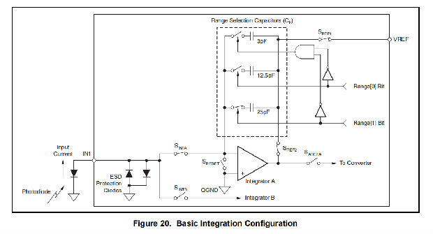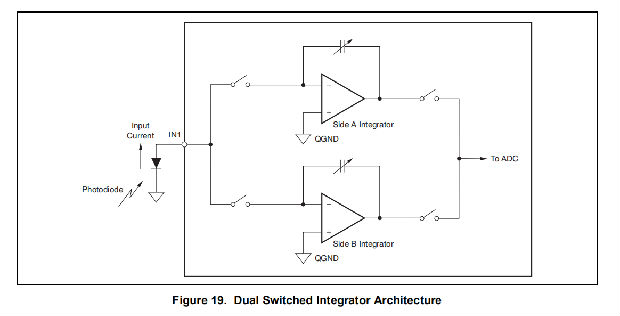 DDC264的双开关积分器输入通道如图19所示。DDC264包含64个相同的输入通道,这些通道执行电流到电压积分以及多路a/D转换的功能。每个输入端都有两个积分器,这样电流电压积分就可以在时间上连续进行。DDC264通过在A侧和B侧之间切换积分来连续集成输入信号。