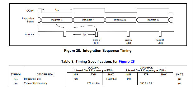 图26显示了在设备通电、复位和配置寄存器编程之后开始的几个集成周期。顶部信号为CONV,由用户提供。集成状态跟踪指示哪一方正在集成。如数据表所述,当数据准备好从DDC264检索时,DVALID变为低电平。它会一直保持在低水平,直到用户将DCLK设为高位,然后又回到低位。DVALID脉冲下方的文本表示可供读取的数据侧。箭头用于将数据与相应的集成相匹配。表3显示了图26的定时规范。