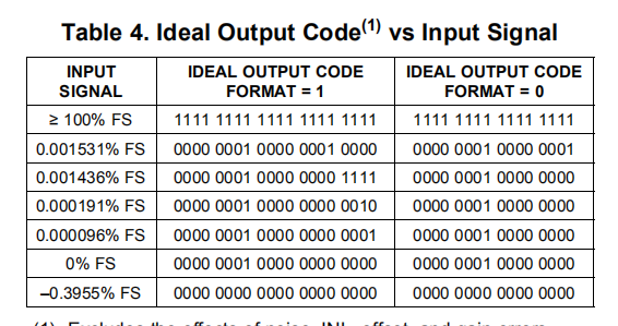 串行输出数据以偏移二进制代码的形式提供,如表4所示。配置寄存器中的格式位选择输出字中使用的位数。当Format=1时,使用20位。当Format=0时,低位四位被截断,因此只使用16位。注意,当Format=0时,LSB的大小是原来的16倍。输出中包含一个偏移量,以允许从限幅读数中输入稍负的输入(例如,来自板泄漏的输入)。此偏移约为正满标度的0.4%。