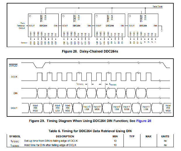 DOUT可与DIN一起使用,以菊花链多个DDC264设备在一起,以减少布线。在这种操作模式下,串行数据输出通过多个DDC264进行移位;见图28。