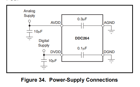 AVDD和DVD都应尽可能安静。消除与DDC264操作不同步的AVDD噪声尤为重要。图34说明了如何为DDC264供电。每个DDC264在AVDD和DVD上都有内部旁路电容器;因此,通常需要的唯一外部旁路电容器是10μF陶瓷电容器,每个PCB一个。建议将模拟和数字接地(AGND和DGND)连接到PCB上的单个接地平面。