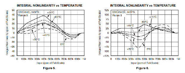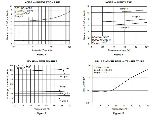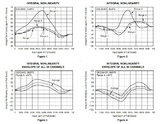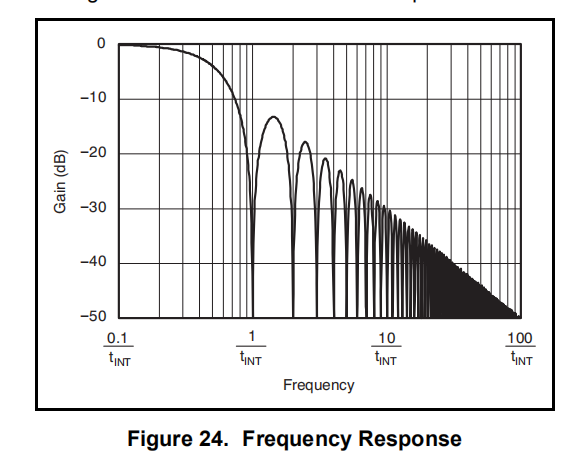 DDC264的频率响应由前端积分器设置,是传统的连续时间积分器的频率响应,如图24所示。通过调整积分时间t INT,用户可以改变3dB带宽和响应中缺口的位置。跟随前端积分器的A/D转换器的频率响应不重要,因为转换器从积分器中采集保持信号。也就是说,A/D转换器的输入总是直流信号。对前端积分器的输出进行采样;因此,可能会出现混叠。每当输入信号的频率超过采样率的一半时,信号就会折回到较低的频率。