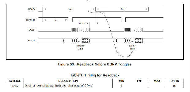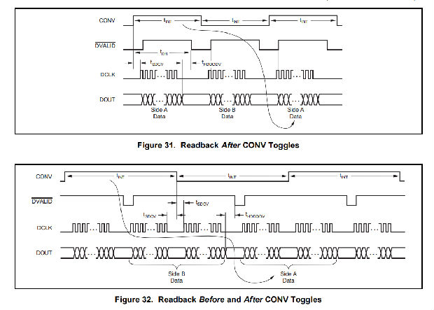 数据有效信号表明数据准备好了。数据检索可能在DVALID变低后开始。该信号是使用从系统时钟CLK中分离出来的内部时钟产生的。内部时钟和时钟周期之间的相位关系是在首次通电时设置的,并且是随机的。由于用户必须使CONV与CLK同步,DVALID信号与CONV具有随机相位关系,不确定度为±1/fCLK。投票DVALID消除了对这种关系的任何顾虑。如果数据回读是从CONV定时的,请确保等待所需的时间。