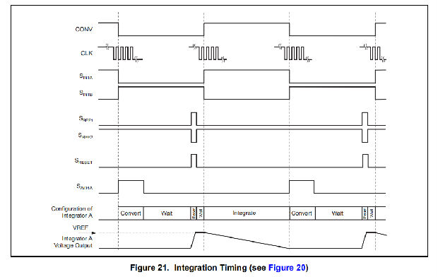 来自输入信号的电荷被收集到集成电容器上,导致放大器的电压输出降低。CONV的下降沿通过将输入信号从A侧切换到B侧(SINTA和SINTB),停止积分。在CONV下降沿之前,B侧的信号被A/D转换器转换,并在A侧积分期间复位。随着变频器下降沿,B侧开始对输入信号进行积分。此时,A侧运算放大器的输出电压被提供给A/D转换器的输入端(见图22d)。