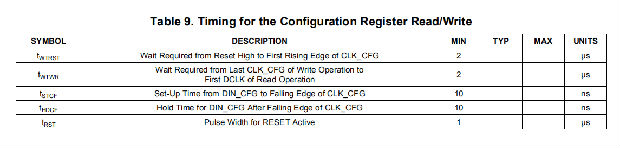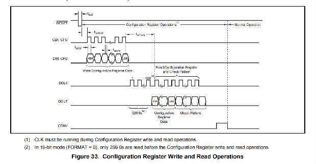 配置寄存器必须在通电或设备复位后进行编程。DIN_CFG、CLK_CFG和RESET引脚用于写入该寄存器。当开始写入操作时,保持CONV low和选通复位;参见图33。然后开始转移DIN上的配置数据_配置数据先写入配置寄存器的最高有效位。数据被内部锁存在CLK_CFG的下降沿。不允许对配置寄存器进行部分写入。请确保在更新寄存器时发送所有16位。