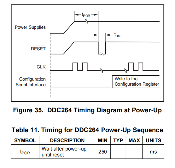 在设备通电之前,所有的数字和模拟输入必须是低的。在通电时,所有这些信号都应该保持在较低的水平,直到电源稳定下来,如图35所示。模拟电源必须在数字电源之前或同时启动。此时,开始向CLK引脚提供主时钟信号。等待时间t或,然后给出复位脉冲。释放复位后,必须写入配置寄存器。表11显示了通电顺序的计时。