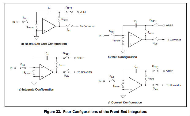 在A/D转换完成时,电荷积分电容器(CF)用SREF1和SRESET复位(见图21和图22a)。此过程在重置期间完成。以这种方式,所选电容器被充电到参考电压VREF。一旦集成电容器充电,SREF和SRESET被切换,以便VREF在等待开始积分时不再连接到放大器电路(见图22b)。随着CONV的上升,SINTA关闭,开始对A侧进行集成。这一过程将积分器阶段置于其集成模式(参见图22c)。
