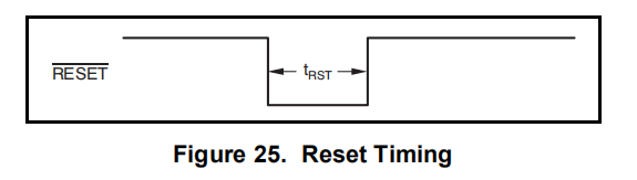 DDC264通过将重置输入设为低值异步重置,如图25所示。确保释放脉冲至少为tRST宽度。这是非常重要的,复位是无故障的,以避免无意的复位。之后必须立即对配置寄存器进行编程。对DDC264编程后,在使用数据之前,至少等待四次转换。