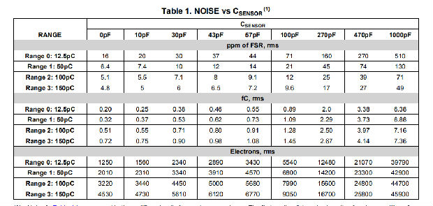 (1)、为了方便读者阅读,表1中的噪声用三种不同的单位表示。第一部分以满标度范围的百万分之一为单位列出噪声;第二部分将噪声表示为等效输入电荷(单位:fC);第三部分将噪声转换为电子。