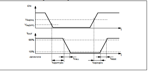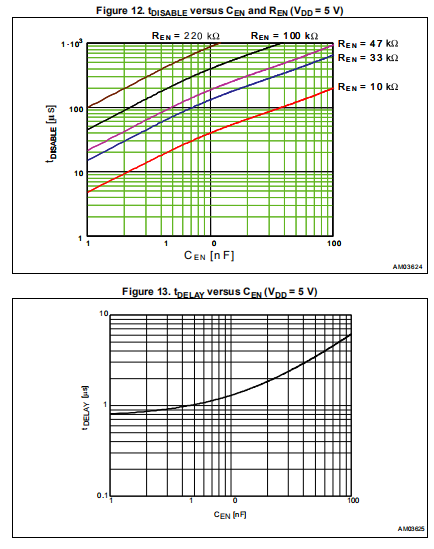 CEN还可用于为引脚EN提供抗快速瞬态噪声的抗扰度。因此CEN值应根据最大容许值选择尽可能大的值延迟时间和REN值应根据所需的禁用时间进行选择。电阻器REN应选择在2.2 K到180 K的范围内。推荐REN和CEN的值分别为100 K和5.6 nF,允许获得200μs禁用时间。