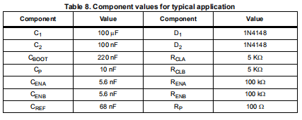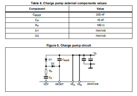 L6206器件集成了两个独立的功率MOS全桥。每个功率MOS具有Rds(ON)=0.3(25°C时的典型值),具有固有的快速续流二极管。十字架通过在开关关闭之间使用一个死区时间(td=1μs,典型值)实现传导保护在一个桥臂上接通两个功率MOS。使用N沟道功率MOS作为桥上晶体管需要栅极驱动电压高于电源电压。获得引导(VBOOT)电源通过一个内部振荡器和几个外部元件来实现电荷泵电路如图5所示。振荡器输出(VCP)是600 kHz(典型)的方波10 V振幅。显示了充电泵电路的建议值/零件号在表6中