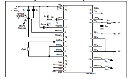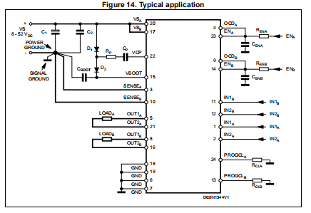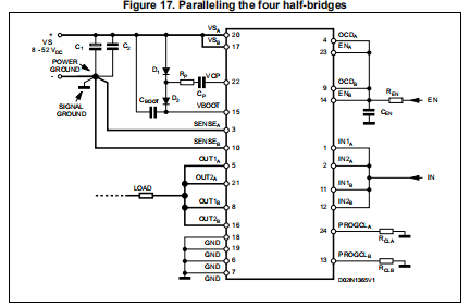 L6206器件的输出可以并联,以提高输出电流能力或者在给定的电流水平下降低设备的功耗。必须指出,但是,内部的电线连接从模具到电源或感测管脚组件必须在两个相关的半桥中承载电流。当两半一个全桥(例如OUT1A和OUT2A)并联连接,峰值电流额定值没有增加,因为总电流必须仍然流过一根连接线电源或感应管脚。此外,过电流检测还检测每个桥(A或B)上部装置中的电流,因此连接一个桥的两半并联桥不会增加过电流检测阈值。对于大多数应用,建议的配置是桥A并联的半桥1对于桥B的半桥1,对于半桥2也是如此,如中所示图15。并联的两个设备中的电流将很好地共享,因为同一芯片上的设备的RDS(ON)匹配良好。当在这种配置中连接过电流检测电路时,该电路检测每个电桥(A和B)中的电流将感应到连接在独立并联,阈值最低的检测电路将首先跳闸。和启用并联连接,第一次检测到上部DMO中的过电流装置将使两座桥都转弯。假设两个DMOS设备共享电流同样,产生的过电流检测阈值将是最小阈值的两倍由图15中的电阻RCLA或RCLB设置。建议使用RCLA=RCLB。在此配置中,生成的网桥具有以下特征: