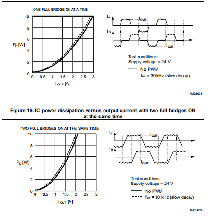 图18和图19显示了输出电流之间的近似关系而IC功耗采用PWM电流控制驱动两个负载,针对两个不同的负载驾驶类型: