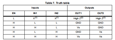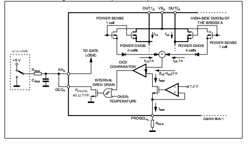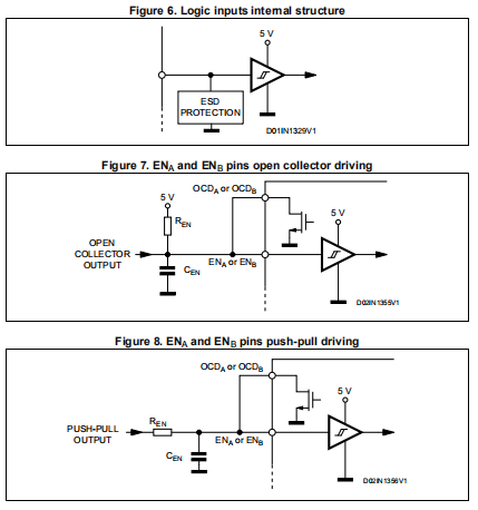 引脚IN1A、IN2A、IN1B、IN2B、ENA和ENB是TTL/CMOS兼容的逻辑输入。这个内部结构如图6所示。开启和关闭阈值的典型值为Vth(开)=1.8 V,Vth(关)=1.3 V。引脚ENA和ENB通常用于实现过电流和热保护将它们分别连接到输出OCDA和OCDB,这两个输出是开漏的输出。如果选择这种连接方式,在驱动这些连接时需要小心别针。图7和图8显示了两种配置。如果由明渠驱动(集电极)结构、上拉电阻REN和电容CEN连接如所示图7。如果驱动器是一个标准的推挽结构,电阻REN和电容CEN的连接如图8所示。电阻REN应选择在该范围内从2.2 k到180 k。REN和CEN的建议值分别为100 K和5.6 nF。有关选择值的更多信息,请参见第5.3节:非耗散过电流检测和保护。