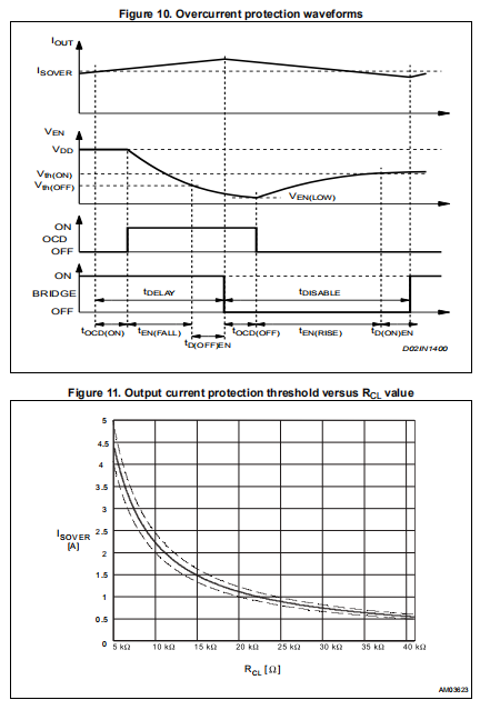 显示输出电流保护阈值与5k.范围内的RCL值至40 k.。恢复正常操作前禁用时间t可以通过逻辑输入的精确阈值的方法。是否受岑、仁的影响值及其大小如图12所示。关闭前的延迟时间t当检测到过电流时,电桥仅取决于CEN值。它震级如图13所示。