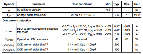 表5。电气特性(环境温度=25°C,Vs=48 V,除非另有规定)(续)