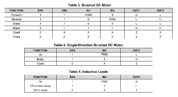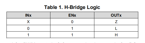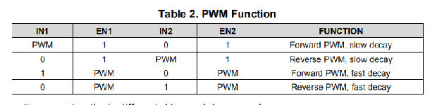 对于使用快速衰减的PWM,PWM信号应用于ENx引脚;对于使用慢速衰减,PWM信号应用于INx引脚。表2是使用OUT1和OUT2作为H桥驱动直流电机的示例: