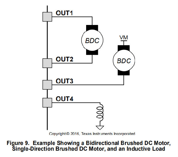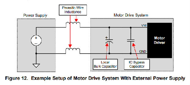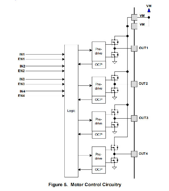 请注意,有多个VM电机电源引脚。所有VM引脚必须连接到电机电源电压。