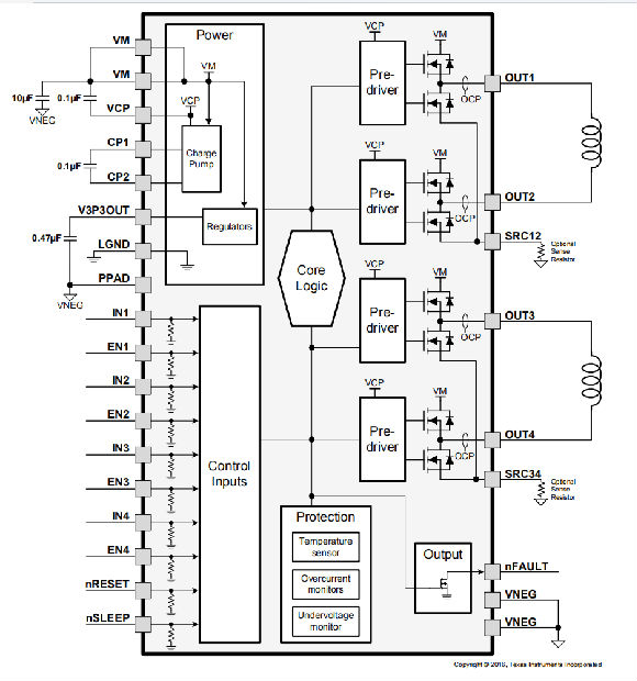 提供独立输入,以独立控制每个1/2 H 电桥。为了允许使用分离电源进行操作,逻辑输入和故障输出是参考一个单独的浮动接地引脚。